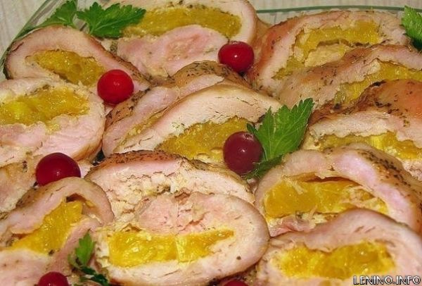 Одно из преимуществ куриного рулета заключается в том, что его можно готовить практически с любой начинкой: это может быть сыр, грибы, вареные яйца и т.д. Таким образом, Вы можете приготовить несколько рулетов с разными начинками и подать их к праздничному столу. Такая закуска наверняка будет оценена Вашими гостями по достоинству!