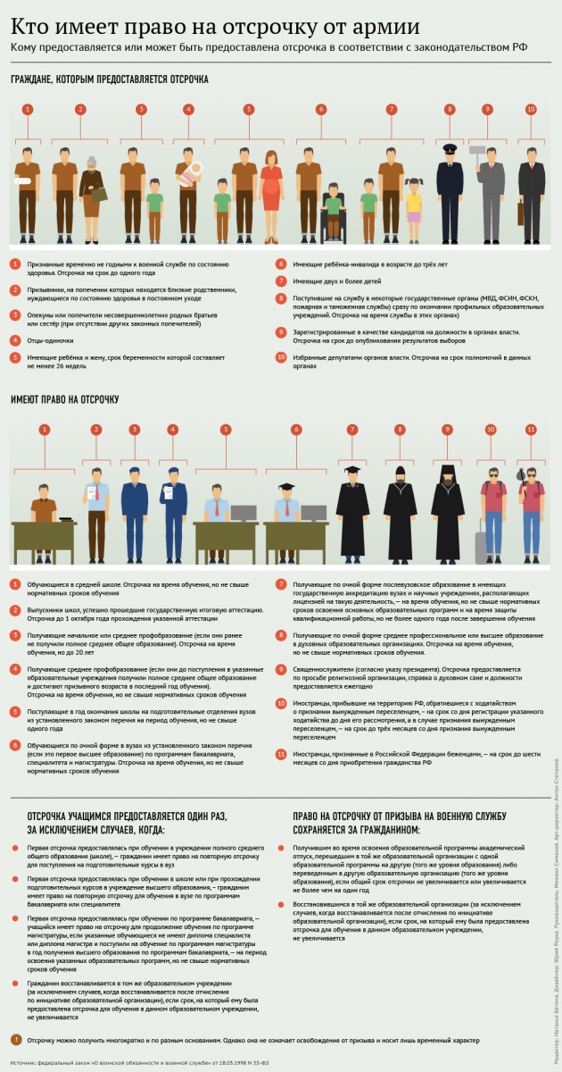 Отсрочки студентам высших учебных заведений, как и раньше, предоставляются независимо от того, является вуз государственным или нет. Если учебная программа имеет государственную аккредитацию, то студент обладает правом на отсрочку до конца обучения.