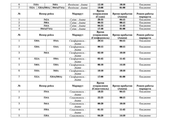 В него включены рейсы между Анапой и Феодосией, Судаком, Симферополем, Севастополем, Евпаторией, а также между Краснодаром и Керчью. Все рейсы будут осуществляться ежедневно.