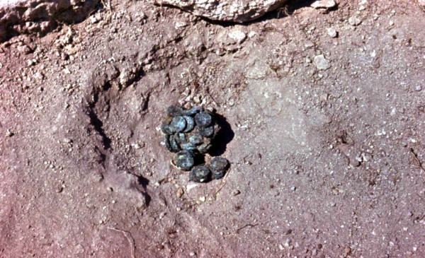 Когда же погибла крепость? Теперь мы знаем это достаточно точно - вскоре после 267 г. Такую дату позволил уточнить клад, найденный автором этих строк на уже раскопанном участке, в центре Илурата. Тогда доследовался небольшой дом, выходивший с восточной стороны на перекресток двух главных улиц. Одно из его помещений, целиком вымощенное каменными плитами, предназначалось для содержания скота. Под угловой плиой этой вымостки и оказался металлический комок зеленоватого оттенка, в котором просматривались монеты. В спекшейся массе они сохранили округлую форму мешочка из кожи или ткани, который владелец второпях спрятал в месте, где вряд ли кто-нибудь стал искать деньги. Когда после экспедиции кладом занялись реставраторыбыло установлено, что он состоял из 66 биллоновых статеров из сплава серебра и меди. Все монеты прекрасной сохранности и имеют на лицевой стороне бюст царя Рескупорида V (242/43-275/76), а на оборотной – изображение правившего в год выпуска монеты римского императора. Они датированы по боспорской эре, которую легко можно перевести в наше летоисчисление, то есть были отчеканены в период от 242 до 267 гг.