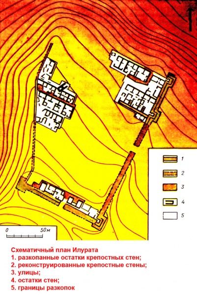 Оборонительные сооружения Илурата, восстановленные около середины II в. н.э. были возведены одновременно с жилыми кварталами в короткие сроки, по единому плану, поэтому многие дома примыкали непосредственно к оборонительным стенам. Таким образом, в случае военной опасности часть воинов могла быстро попасть в башню или подняться на стену прямо со двора собственного дома. Основой регулярной планировки города являются две главных улицы, пересекающиеся под прямым углом и выходящие к воротам. Илуратские дома образуют городские кварталы, жизнь обитателей которых была надежно укрыта от посторонних глаз глухими стенами, выходившими на улицу. Бедные владельцы обходились камышовой крышей и глиняной обмазкой стен, состоятельные - могли позволить себе отделку парадных помещений штукатуркой и даже мраморной облицовочной плиткой, а также устройство черепичной кровли. Как правило, одно из помещений первого этажа с глинобитным полом предназначалось для приготовления пищи. Готовили на большой печи из вертикально установленных плит с одним или двумя-тремя каменными столбиками внутри. На них ставилась саманная плита-жаровня с бортиками, выступающими на 3-4 см вверх. На раскаленной поверхности таких жаровен, очевидно, выпекались хлебные лепешки. Судя по золе, основным топливом служила солома. Дым выходил через дверь или специальное отверстие в стене. Возле таких печей илуратские женщины проводили немало времени и имя одной из них - «Дикалия» - было небрежно вырезано ножом на торце печной плиты. Нередко рядом находились стенные ниши, использовавшиеся в хозяйственных целях. В каждом из домов были также зерновые или хозяйственные ямы, выдолбленные в скале и закрывавшиеся каменными крышками. Зерно или вино могли хранить в громоздких пифосах – глиняных бочках с уплощенным дном, емкостью до 600 л, а высотой до 1,5 м и более. Часть помещений предназначалась для содержания и кормления молодняка скота в зимний период. Они имеют загородки из каменных плит с отверстиями для привязывания и перекрыты плитовыми вымостками, что согласно рекомендациям античных авторов, писавших о сельском хозяйстве, должно было предотвратить застаивание нечистот.