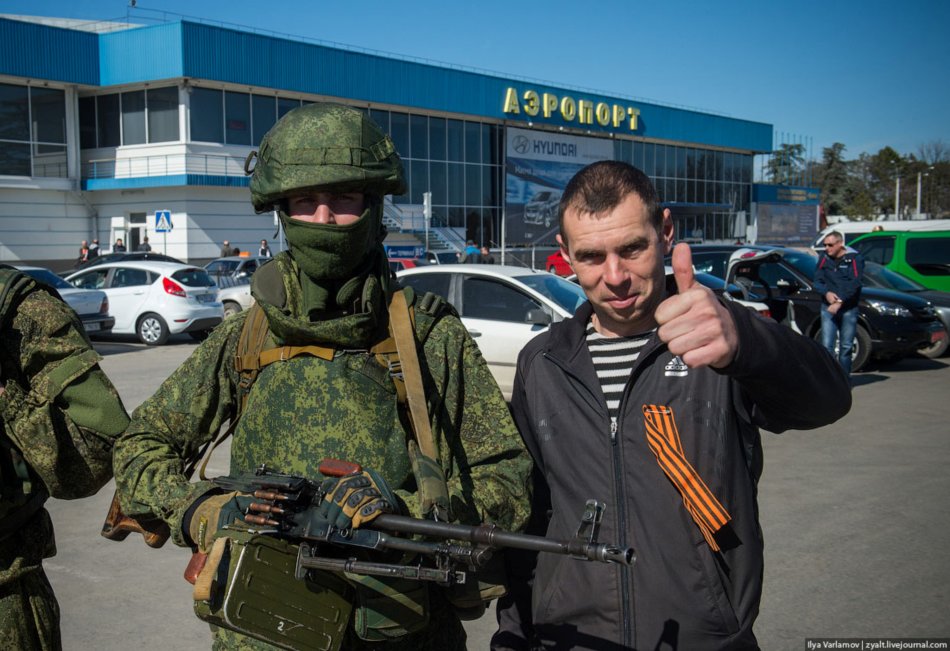Позже выяснилось, что мужик с георгиевской ленточкой бригадир группы таких же мужиков, которые дежурят в аэропорту и поддерживают порядок. Выглядит они очень фальшиво, но довольно доброжелательные и общительные. Похожи на агитаторов на платных митингах. Таксисты тихо хихикают над бойкими мужиками в спортивных костюмах. Солдаты ходят спокойно, с радостью позируют и фотографируются, но не разговаривают. Все это похоже на какой-то парад.