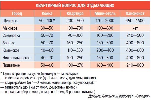 Квартирный фонд по сути пустующего города атомщиков предопределяет недорогой и, возможно, самый дешевый в Крыму экологически чистый (Крымская АЭС так и осталась нереализованным проектом) отдых. В конце августа и в сентябре 1-комнатную квартиру можно снять за 150—240 грн в сутки, а 3-комнатная обойдется в пределах 350—450 грн. Для компании из 5—6 человек бюджет составит около 75—90 грн в сутки! Дачу (огородный 2-этажный домик) в Семеновке или в Новоотрадном реально снять за 60—150 грн. в день с человека. И всё это на расстоянии 200—600 м от моря.