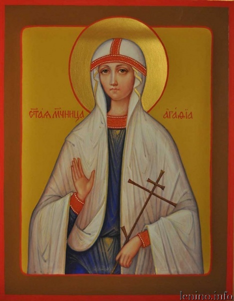 святой Агаты (Агафии) — христианской мученицы, жившей в 3 веке. Согласно преданию, она родилась на Сицилии в богатой семье. В молодости Агата отвергла домогательства городского префекта, а тот, пользуясь антихристианскими законами, подверг ее преследованиям. Несмотря на пытки девушка не отказалась ни от своих моральных принципов, ни от веры.