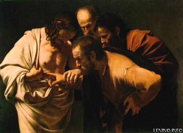 В Евангелии от Иоанна сказано, что Фома, который отсутствовал при первом явлении воскресшего Христа, не поверил в это и потребовал доказательств. Фома хотел сам удостовериться и потрогать раны от гвоздей на руках и ногах Христа и рану на боку. Явившись апостолам во второй раз, Иисус предложил вложить палец в раны. После этого Фома уверовал.