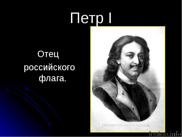 Законным же «отцом» триколора признан Петр I. (20) 31 января 1705 года он издал Указ, согласно которому «на торговых всяких судах» должны поднимать бело-сине-красный флаг, сам начертал образец и определил порядок горизонтальных полос.