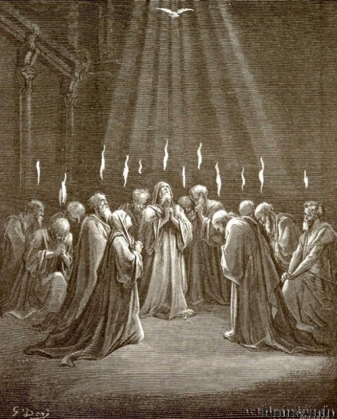 После вознесения Иисуса Христа наступил десятый день: это был пятидесятый день после Воскресения Христова. У евреев был великий праздник Пятидесятницы в память Синайского законодательства. Все апостолы вместе с Божией Матерью и с другими учениками Христовыми и прочими верующими единодушно находились в одной горнице в Иерусалиме.