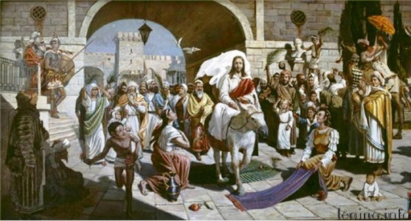 У евреев был обычай: цари и победители въезжали в Иерусалим на конях или ослах, и народ торжественными криками, с пальмовыми ветвями в руках встречал их. Исполняя пророчества Ветхого Завета (Зах. 9,9), Христос именно таким торжественным образом въезжал в Иерусалим, но не как Царь земной или победитель в войне, а как Царь, Царство Которого не от мира сего, как Победитель греха и смерти. Это царское прославление Христа перед Его смертью Церковь вспоминает для показания, что страдания Спасителя были вольными.