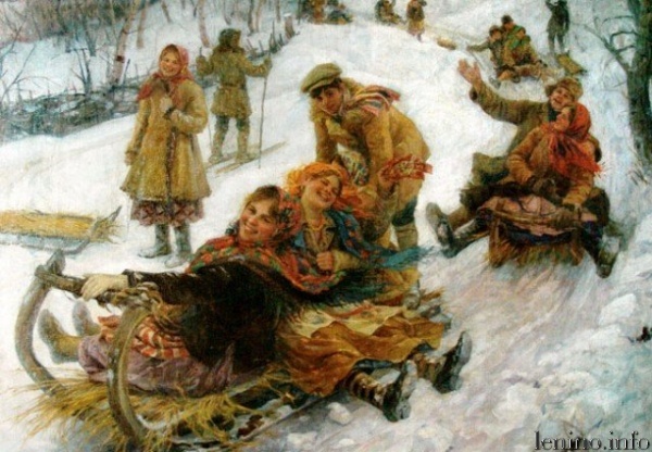 Те, кто не мог позволить себе кататься на расписных санях, брали санки или простые дощечки и шли кататься с горок — обычно с крутых берегов рек прямо на лед. И здесь в центре внимания были молодожены. Выходя из дома, они обязательно должны были пройти по тулупу, вывернутому мехом наружу, чтобы защититься от дурного глаза.