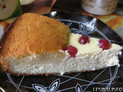 При выпечке "тяжелая" творожная начинка опускается вниз, а бисквит поднимается, образуя бортики.