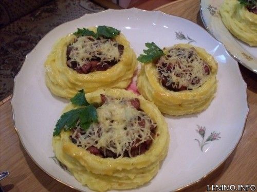Противень необходимо застелить бумагой для выпечки. Дальше при помощи кондитерского шприца выдавливайте картофельное пюре. Корзинку необходимо смазать куриным желтком. Отправьте подготовленные корзинки в духовочку и выпекайте при температуре 180°. Как только корзиночки подрумянятся, добавьте в них начинку, посыпьте сыром и отправьте в духовку еще минут на 15.
