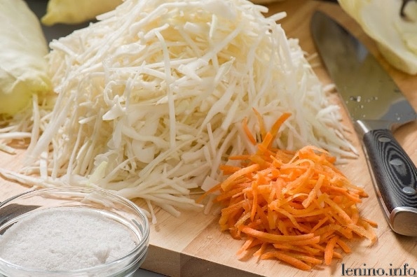 Нарезать капусту и сложить горкой. Потереть морковь и сложить поверх капусты. Морковь посыпать солью и сахаром, и всё хорошенько перемешать, но не агрессивно, а нежно. Хорошо, если у вас есть большая миска, в миске это делать гораздо удобней. Как только морковь равномерно распределится по капусте, попробуйте на соль и на сахар. Вкус должен быть таким, чтобы вам было приятно съесть это прямо сейчас, в качестве салата. Наполните банку капустой плотно, но без фанатизма, стараясь хоть и утрамбовывать капусту, но всё-таки щадить её. Не заполняйте банку до самого верха - оставьте немного места для выделяющегося из капусты сока.