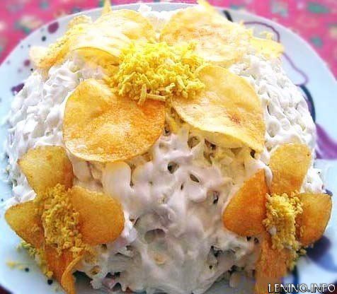 Перед подачей на стол украсьте салат чипсами и тертым желток, выкладывая из чипсов лепестки орхидеи, а из желтка серединку цветка.