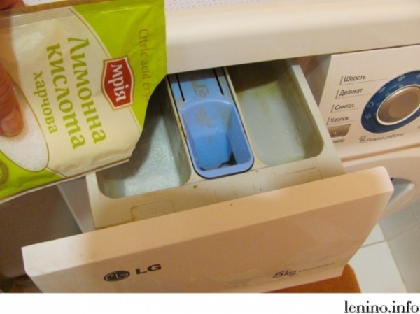Очистить машину от накипи и водяного камня поможет обычная лимонная кислота. В отсек для порошка засыпаем 60 грамм лимонной кислоты. Запускаем машинку на полный цикл стирки с максимально высокой температурой.