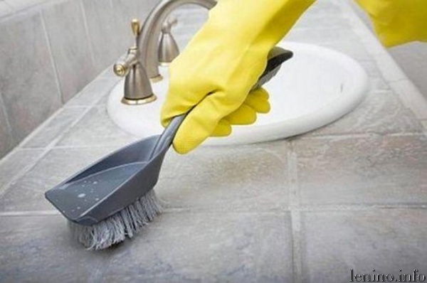 Смешиваем теплую воду с перекисью водорода в пропорциях 2:1. Щеткой или губкой чистим швы между плитками этим раствором, который потом можно не смывать.