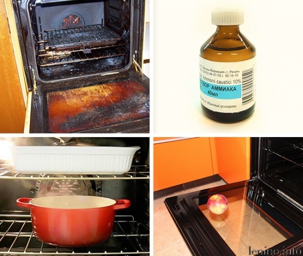 Утром в емкость с нашатырем добавляем несколько чайных ложек любого моющего средства и полчашки теплой воды. Губкой с полученным раствором протираем духовку и промываем ее водой.