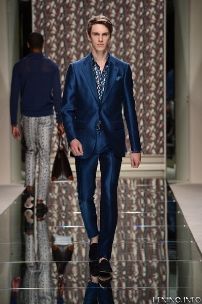 Светло-синий однобортный пиджак из шерсти с шелком с двумя пуговицами, обтянутыми той же тканью, дизайнеры респектабельной итальянской марки предлагают дополнить классическими прямыми брюками из матовой шерсти и туфлями из матовой и лакированной кожи. Сорочка может быть белой или льдисто-голубой.