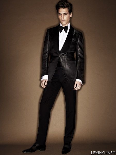 Если бы вечерняя одежда от Тома Форда нуждалась в дополнительных рекомендациях, достаточно было бы сказать, что именно ее выбрал недавно для своей свадьбы актер Алек Болдуин. Если же поклонникам бренда хочется чего-то посмелее, чем матовая черная классика, которую он предпочел, стоит выбрать хит сезона - смокинг из ткани с рельефной выработкой и черные зауженные брюки.