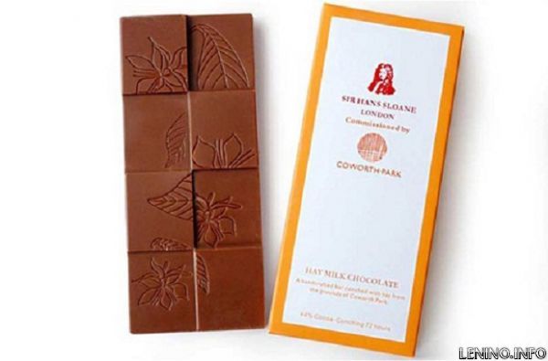 Вслед за засушенными лепестками цветов и редкими приправами в шоколад начали добавлять и луговые травы. Специально для виндзорской пятизвездочной гостиницы Coworth Park известный английский шоколатье сэр Ханс Слоун придумал и изготовил особый сорт шоколада из несовместимых на первый взгляд ингредиентов — какао-бобов и сена. Эксклюзивные плитки появляются на свет в результате смешивания шоколадной массы со специально высушенной и измельченной травой, скошенной на лугах по соседству с отелем. Помимо запаха сена, в шоколаде Hay milk chocolate также уловимы ноты жасмина, розы и шафрана — все это, по задумке автора, должно олицетворять пасторальную тишину окрестностей гостиницы. Правда, возможность оценить это есть далеко не у всех: о широкой продаже необычного шоколада речь пока не идет, и попробовать его можно, либо став гостем отеля Coworth Park, либо приобретя шоколад в магазине при гостинице.