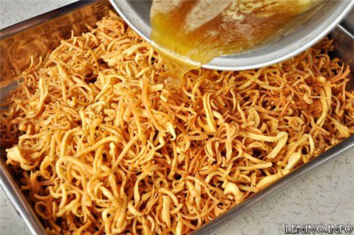 залить лапшу горячим медовым сиропом, и аккуратно перемешать сначала двумя деревянными, или силиконовыми лопатками, затем, смоченными холодной водой руками. Перемешиваем осторожно, чтобы не поломать и не помять «лапшу». Не обожгитесь, сироп горячий!