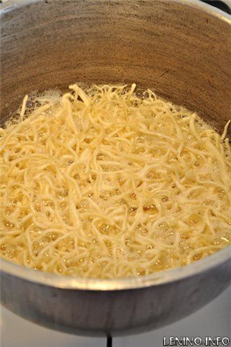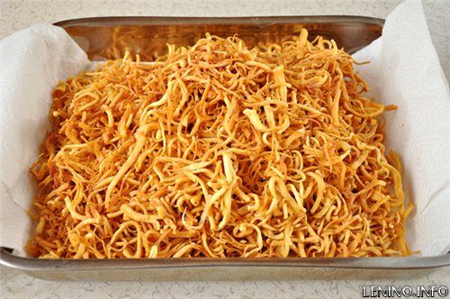 В казане разогреть растительное масло, и частями, маленькими партиями(примерно горсть), по-быстрому (на среднем огне), обжарить лапшу. Обжариваем буквально 1-2 минуты, пару раз помешав. Чуть только позолотела "лапша" сразу же вынимаем шумовкой, и выкладываем в чашку на бумажную кухонную салфетку, чтобы она впитала весь лишний жир. Лапшу не пережаривайте, она должна быть светло-золотистого цвета.