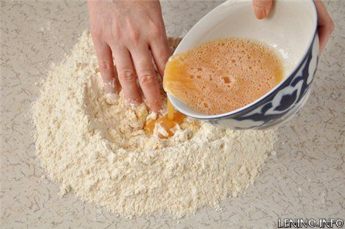 На рабочую поверхность насыпать муку горкой, сделать в ней лунку, и постепенно вливать туда яйца, взбитые с солью и содой, замешивая тесто. Тесто не должно быть липким и мягким. Убрать замешанное тесто в пакет на 15-20 минут.