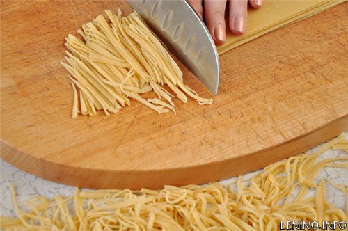 Нарезать из полос тонкую лапшу, раскидать её по столу.