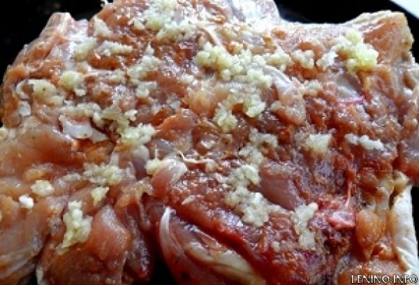 3. Далее размазываем чеснок по поверхности мяса. Посыпаем солью, молотым перцем и специями. Все эти приправы стараемся равномерно распределить по поверхности мяса.