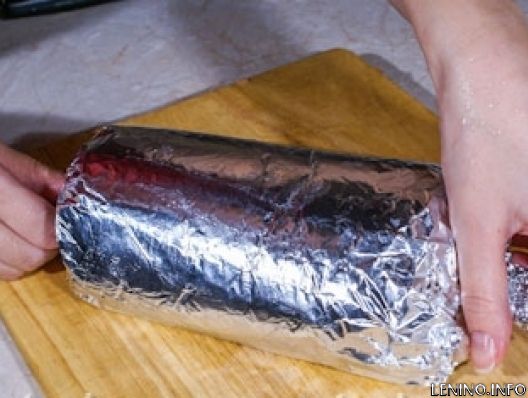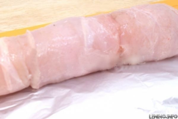 7. Смазываем куски фольги небольшим количеством растительного масла и заворачиваем в них получившиеся рулеты. После этого выкладываем рулеты на противень и ставим в разогретую духовку. Запекаем при температуре 180 градусов в течение 30-35 минут.
