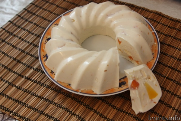 Часть фруктов (опять же по вкусу, я оставила стаканчик "на поесть", остальные выложила) выкладывается в творог со сгущенкой и опять перемешивается. 25 грамм желатина (2 пакетика) развести в стакане сока из под фруктов и нагреть до полного растворения желатина. После чего желатин в соке немного остудить и добавить в творог.