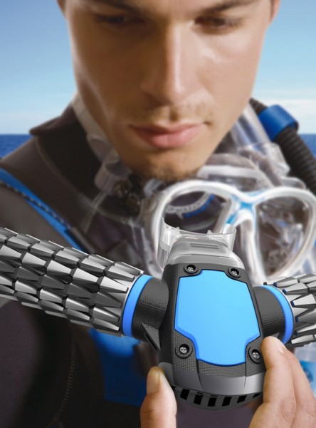 Регулятор включает в себя пластиковый загубник, который вам требуется просто прикусить. Два крыла по бокам маски работают как эффективные жабры морского животного. Их чешуйчатая текстура скрывает маленькие отверстия, через которые вода всасывается внутрь респиратора. Камеры внутри крыльев отделяют кислород и выпускают жидкость обратно – таким образом, позволяя вам комфортно дышать под водой.