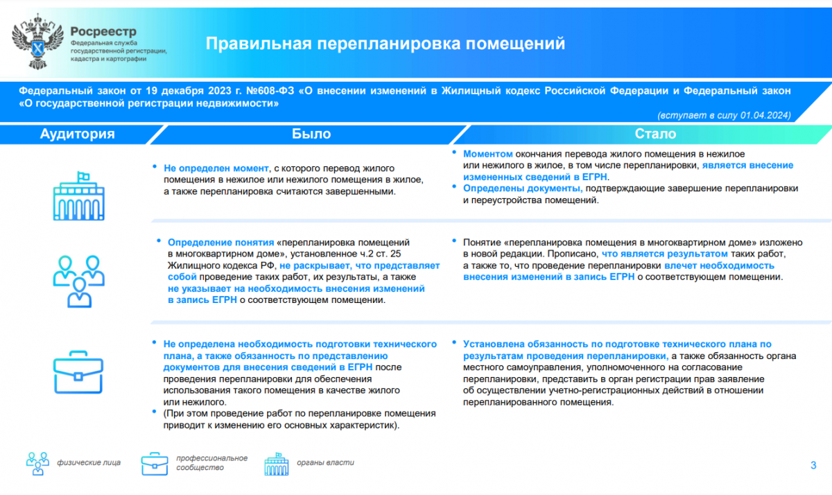 «Заявителю после завершения перепланировки больше не нужно будет тратить время, чтобы предоставить в Росреестр документы для внесения изменений в ЕГРН. За него это сделают органы местного самоуправления - после утверждения акта приемочной комиссии они теперь будут обязаны самостоятельно подавать в орган регистрации прав заявления о государственном кадастровом учёте или регистрации права заявителя на перепланированное помещение», — отметил заместитель руководителя Росреестра Алексей Бутовецкий.