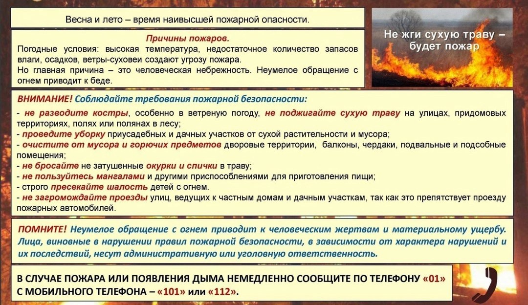 Ежегодно с наступлением жаркой погоды ситуация с пожарами становится более напряжённой. В это время часто можно увидеть несанкционированное сжигание сухой травы и мусора, что может привести к лесным пожарам и, как следствие, к возгоранию хозяйственных построек и жилых домов.