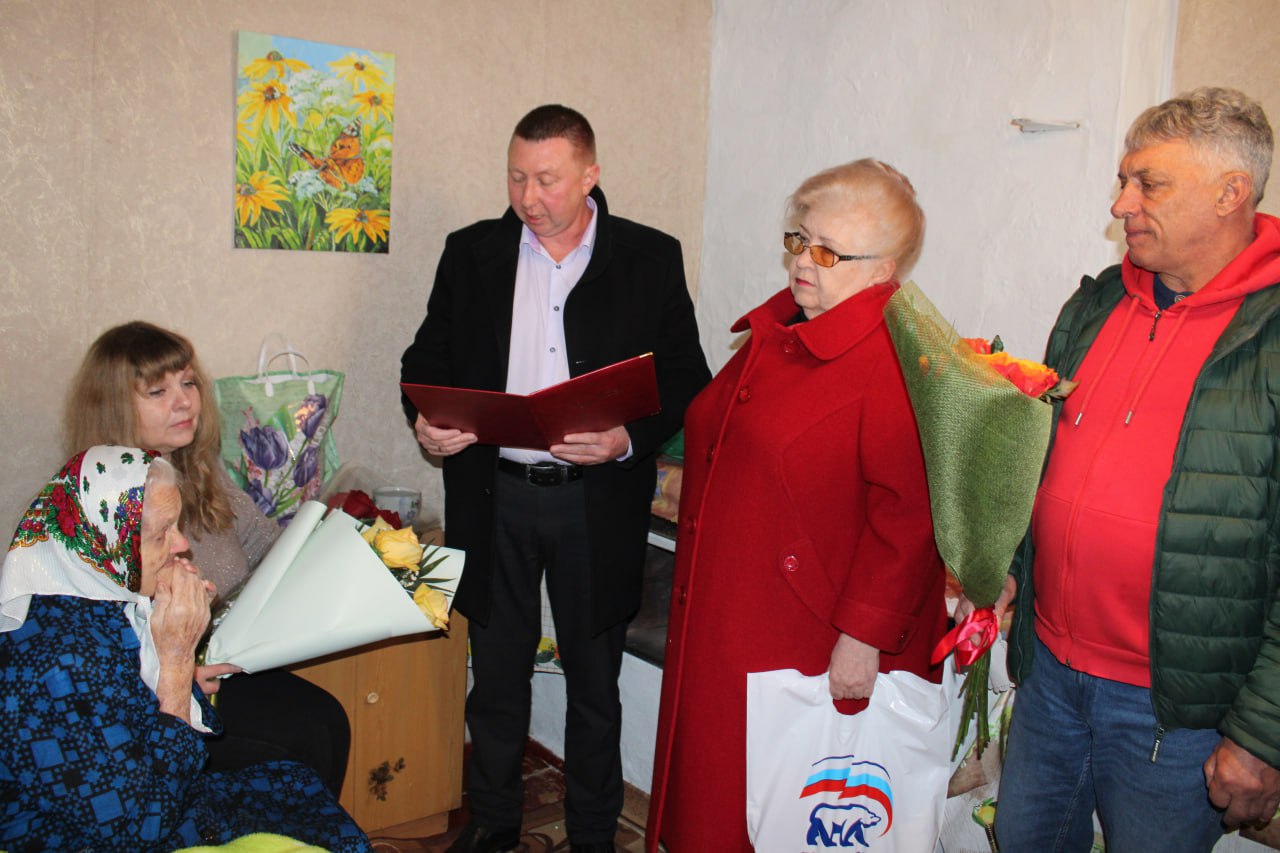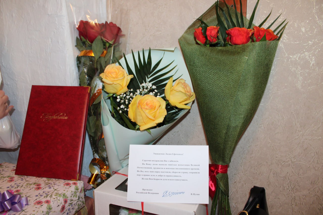 В юбилейный день рождения Лидии Ефимовне вручили подарки, передали виновнице торжества поздравительное письмо от Президента России. Много было цветов, добрых слов и горячих поздравлений. С юбилеем!