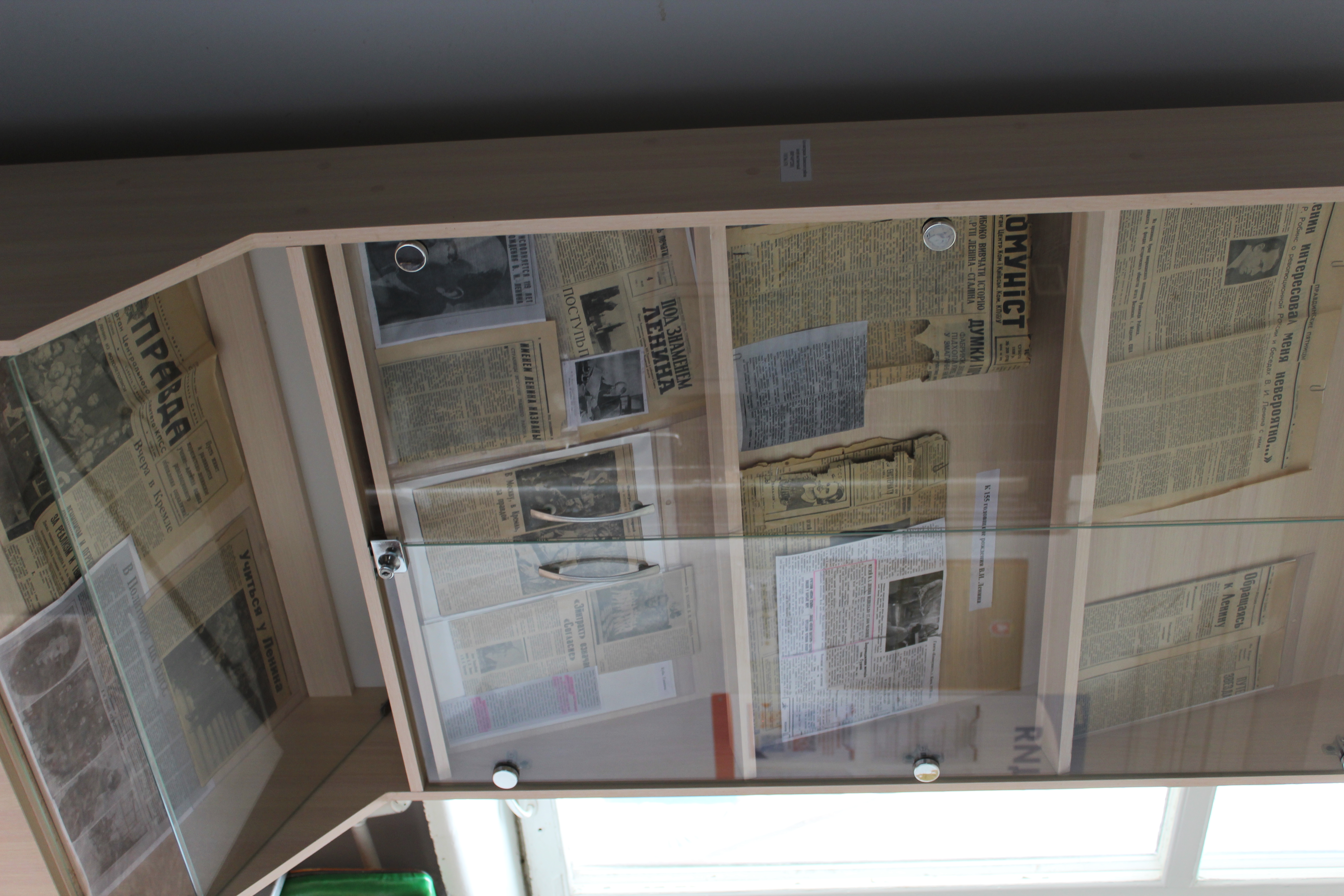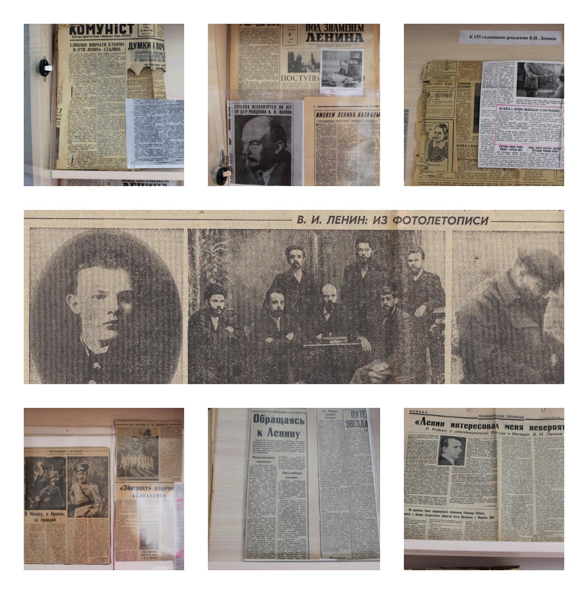 На выставке представлены статьи из газет «Комуніст», г. Киев, 1938 года, «Под знаменем Ленина», пгт. Ленино, 1965 года, «Правда», г. Москва, 1989 года.