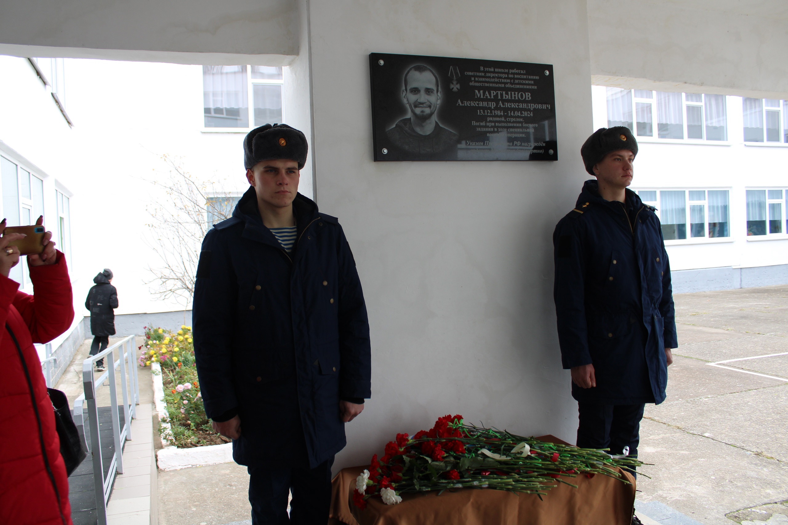 Сегодня в городе Щелкино на фасаде МБОУ СОШ № 2 им. Л.П. Шведченко открыли мемориальную доску участнику СВО Александру Мартынову
