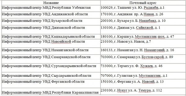 Граждане, из числа армянского, болгарского, греческого, крымско-татарского, немецкого народов, выселенные в административном порядке с территории Республики Крым, и подлежащие реабилитации, имеют возможность самостоятельного направления заявлений в региональные подразделения МВД Республики Узбекистан (список адресов прилагается) с целью документального подтверждения применения в отношении их политических репрессий (архивной справки).