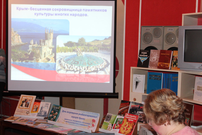 Ведущая Ирина Роменская познакомила учеников с Крымом, как одним из самих многонациональных регионов России. В Крыму проживают люди 175 национальностей: крымские татары, армяне, немцы, болгары, греки, итальянцы, русские, украинцы и другие. Из рассказа библиотекаря ребята узнали как заселяли крымские земли и благодаря чему полуостров стал богаче и краше. На мероприятии говорили с ребятами о недопустимости выделять роль и значение того или иного народа. Для истории человечества важен каждый народ, даже самый немногочисленный.