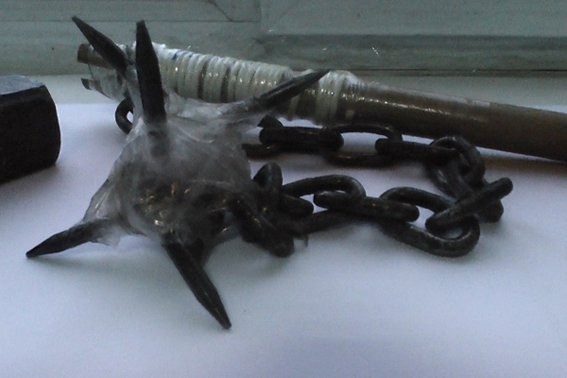 Они напоминают самодельную булаву: к рукоятке молотка примотана цепь, на конце которой — гвозди острием в стороны.
