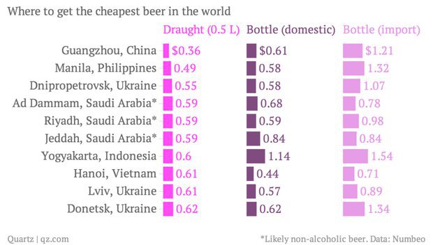 В первой десятке также оказались три города в Саудовской Аравии (безалкогольное пиво), Джокьякарта в Индонезии, Ханой во Вьетнаме, а также украинские Львов (61 цент) и Донецк (62 цента).