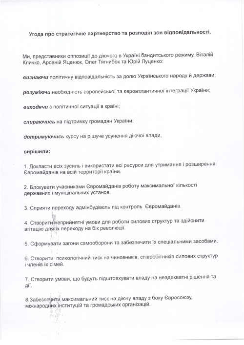 Во-вторых, с сервера скачали несколько документов о сотрудничестве оппозиционных партий. В частности, договор о стратегическом партнерстве между оппозиционерами, дополнение к которому содержит список распределения государственных должностей в случае отстранения от власти Виктора Януковича.