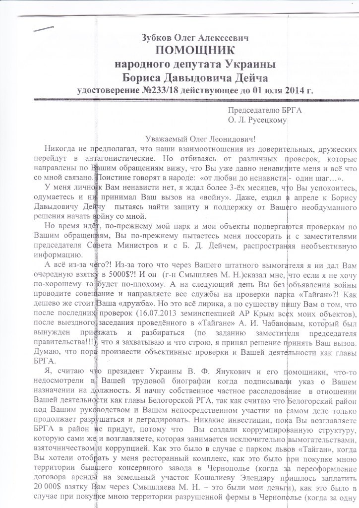 «А все из-за чего? Из-за того, что я не дал вам очередную взятку в 5000 долларов. А на следующий день вы (Русецкий) проводите совещание и направляете все службы на проверку парка «Тайган», — написал Зубков.