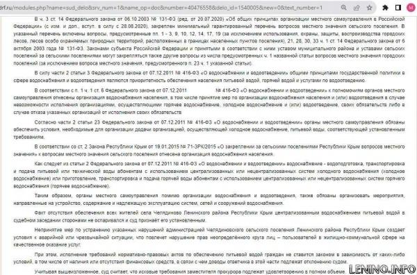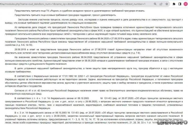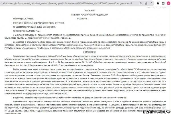 Также ответчик пояснил, что жители села сами не желают вступать в кооператив ПК «Родник», а администрация организовала подвоз питьевой воды на основании договора, заключённого с Ленинским филиалом ГУП РК «Вода Крыма».
