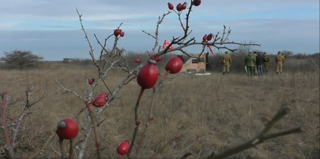 Поисковики-историки Керченского полуострова: Николай Шевченко, Николай Рак, Михаил Сильченко, Сергей Жаботинский, Глава Администрации Войковского сельского поселения Игорь Крутьков благоустроили воинское захоронение, установили мемориальную доску, почтили минутой молчания память солдат захороненных на высоте.